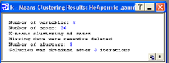 Рис. 3.12. Вікно з результатами Цей метод кластеризації дозволяє також отримати додаткову інформацію стосовно середніх значень по об’єктах ,які зазначені на рисунку 3.13. та евклідової відстані між центрами кластерів зазначеної на рисунку 3.14.: