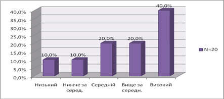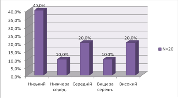 Рис 3.2.1 Якісна характеристика об'єму уваги хлопців початкових класів З рисунку 3.2.1 видно, що у більшості (40%) хлопців другого класу виявлений низький рівень об'єму уваги. Високий та середній рівень розвитку об'єму уваги визначений у 20%. В одинакової кількості хлопців другого класу спостерігається нижчій за середній та вищий за середній рівнь розвитку об'єму уваги (по 10% відповідно).