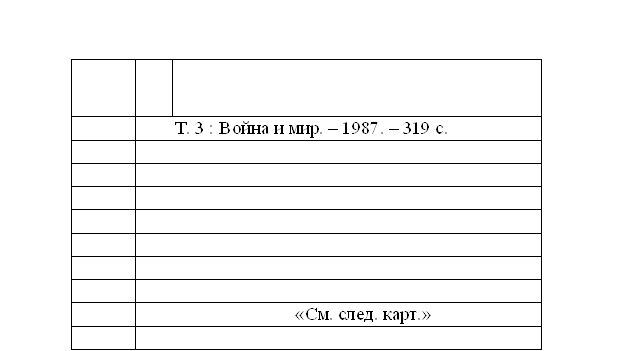 При составлении записи на сборник произведений разных авторов, не имеющий общего заглавия, сведения о произведениях разных авторов разделяют точкой. В заголовке приводят имя автора первого произведения. Библиографическая запись на сборник произведений нескольких авторов, имеющий общее заглавие, оформляется по общим правилам. При этом каждый из авторов рассматривается в качестве соавтора сборника. На имя соавтора (второго и третьего) оформляется добавочная библиографическая запись. ЗАДАНИЕ 7. Сводное библиографическое описание: библиографическое описание многотомного или сериального издания в целом, либо нескольких составляющих его томов, выпусков, номеров и т.д. Сводное библиографическое описание состоит из двух частей – общей части и спецификации. Общая часть (сводного библиографического описания): часть сводного библиографического описания, содержащая сведения , которые характеризуют многотомное или сериальное издание или ряд томов (выпусков) в целом. Спецификация (сводного библиографического описания): часть сводного библиографического описания, содержащая сведения об отдельных томах (выпусках) многотомного или сериального издания. При открытой форме спецификация каждого тома, выпуска, годового комплекта начинается со следующей карточки. Карточки нумеруются снабжаются пометкой «См. след. Карт.» в нижнем правом углу. Библиографическая запись на второй и последующих карточках начинаются со второй строки.
