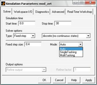 Рис. Вкладка Solver при выборе фиксированного шага расчета При выборе Fixed-step необходимо также задать режим расчета (Mode). Для параметра Mode доступны три варианта: MultiTasking (Многозадачный) – необходимо использовать, если в модели присутствуют параллельно работающие подсистемы, и результат работы модели зависит от временных параметров этих подсистем. Режим позволяет выявить несоответствие скорости и дискретности сигналов, пересылаемых блоками друг другу. SingleTasking (Однозадачный) - используется для тех моделей, в которых недостаточно строгая синхронизация работы отдельных составляющих не влияет на конечный результат моделирования. Auto (Автоматический выбор режима) - позволяет Simulink автоматически устанавливать режим MultiTasking для тех моделей, в которых используются блоки с различными скоростями передачи сигналов и режим SingleTasking для моделей, в которых содержатся блоки, оперирующие одинаковыми скоростями. При выборе Variable-step в области появляются поля для установки трех параметров: Мах step size - максимальный шаг расчета. По умолчанию он устанавливается автоматически (auto) и его значение в этом случае равно (SfopTime — StartTime)/50. Довольно часто это значение оказывается слишком большим, и наблюдаемые графики представляют собой ломаные (а не плавные) линии. В этом случае величину максимального шага расчета необходимо задавать явным образом. Мin step size - минимальный шаг расчета. Initial step size - начальное значение шага моделирования. При моделировании непрерывных систем с использованием переменного шага необходимо указать точность вычислений: относительную (Relative tolerance) и абсолютную (Absolute tolerance). По умолчанию они равны соответственно 10-3 и auto. Output options (Параметры вывода) В нижней части вкладки Solver задаются настройки параметров вывода выходных сигналов моделируемой системы (Output options). Для данного параметра возможен выбор одного из трех вариантов: Refine output (Скорректированный вывод) – позволяет изменять дискретность регистрации модельного времени и тех сигналов, которые сохраняются в рабочей области MATLAB с помощью блока То Workspace. Установка величины дискретности выполняется в строке редактирования Refine factor, расположенной справа. По умолчанию зна чение Refine factor равно 1, это означает, что регистрация производится с шагом D t = 1 (то есть для каждого значения модельного времени:). Если задать Refine factor равеным 2, это означает, что будет регистрироваться каждое второе значение сигналов, 3 - каждое третье т. д. Параметр Refine factor может принимать только целые положительные значения Produce additional output (Дополнительный вывод) — обеспечивает дополнительную регистрацию параметров модели в заданные моменты времени; их значения вводятся в строке редактирования (в этом случае она называется Output times) в виде списка, заключенного в квадратные скобки. При использовании этого варианта базовый шаг регистрации (D t) равен 1. Значения времени в списке Output times могут быть дробными числами и иметь любую точность. Produce specified output only (Формировать только заданный вывод) — устанавливает вывод параметров модели только в заданные моменты времени, которые указываются в поле Output times (Моменты времени вывода). Установка параметров обмена с рабочей областью Элементы, позволяющие управлять вводом и выводом в рабочую область MATLAB промежуточных данных и результатов моделирования, расположены на вкладке Workspace I/O (рис.).