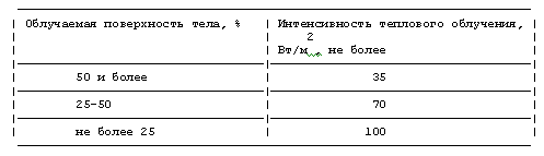 Допустимые величины интенсивности теплового облучения работающих на рабочих местах от производственных источников, нагретых до темного свечения (материалов, изделий и др.) должны соответствовать значениям, приведенным в табл.5. Таблица 5 Допустимые величины интенсивности теплового облучения поверхности тела работающих от производственных источников