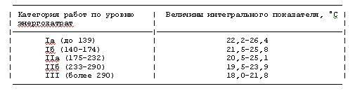 Допустимые величины интенсивности теплового облучения работающих от источников излучения, нагретых до белого и красного свечения (раскаленный или расплавленный металл, стекло, пламя и др.) не должны превышать 140 Вт/кв.м. При этом облучению не должно подвергаться более 25% поверхности тела и обязательным является использование средств индивидуальной защиты, в том числе средств защиты лица и глаз. При наличии теплового облучения работающих температура воздуха на рабочих местах не должна превышать в зависимости от категории работ следующих величин: 25° С - при категории работ Iа; 24° С - при категории работ Iб; 22° С - при категории работ IIа; 21° С - при категории работ IIб; 20° С - при категории работ III. В производственных помещениях, в которых допустимые нормативные величины показателей микроклимата невозможно установить из-за технологических требований к производственному процессу или экономически обоснованной нецелесообразности, условия микроклимата следует рассматривать как вредные и опасные. В целях профилактики неблагоприятного воздействия микроклимата должны быть использованы защитные мероприятия (например, системы местного кондиционирования воздуха, воздушное душирование, компенсация неблагоприятного воздействия одного параметра микроклимата изменением другого, спецодежда и другие средства индивидуальной защиты, помещения для отдыха и обогревания, регламентация времени работы, в частности, перерывы в работе, сокращение рабочего дня, увеличение продолжительности отпуска, уменьшение стажа работы и др.). Для оценки сочетанного воздействия параметров микроклимата в целях осуществления мероприятий по защите работающих от возможного перегревания рекомендуется использовать интегральный показатель тепловой нагрузки среды (ТНС).(10) 2.4 Определение индекса тепловой нагрузки среды (ТНС-индекса) 1. Индекс тепловой нагрузки среды (ТНС-индекс) является эмпирическим показателем, характеризующим сочетанное действие на организм человека параметров микроклимата (температуры, влажности, скорость движения воздуха и теплового облучения). 2. ТНС-индекс определяется на основе величин температуры смоченного термометра аспирационного психрометра (tвл.) и температуры внутри зачерненного шара (tш). 3. Температура внутри зачерненного шара измеряется термометром, резервуар которого помещен в центр зачерненного полого шара; tш отражает влияние температуры воздуха температуры поверхностей и скорости движения воздуха. Зачерненный шар должен иметь диаметр 90 мм, минимально возможную толщину и коэффициент поглощения 0,95. Точность измерения температуры внутри шара +-0,5° С. 4. ТНС-индекс рассчитывается по уравнению: ТНС = 0,7 x tвл. + 0,3 x tш. 5. ТНС-индекс рекомендуется использовать для интегральной оценки тепловой нагрузки среды на рабочих местах, на которых скорость движения воздуха не превышают 0,6 м/с, а интенсивность теплового облучения - 1200 Вт/м2 . 6. Метод измерения и контроля ТНС-индекса аналогичен методу измерения и контроля температуры воздуха (п.п.7.1-7.6 настоящих Санитарных правил). 7. Значения ТНС-индекса не должны выходить за пределы величин, рекомендуемых в табл.6.(10) Таблица 6 Рекомендуемые величины интегрального показателя тепловой нагрузки среды (ТНС-индекса)для профилактики перегревания организма
