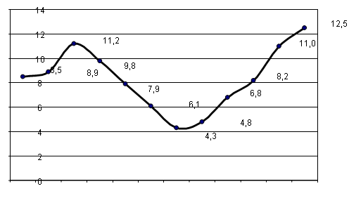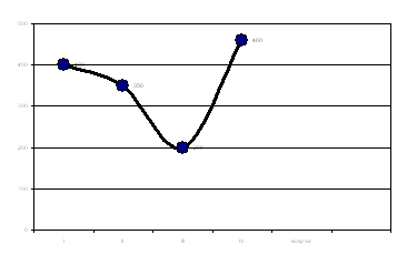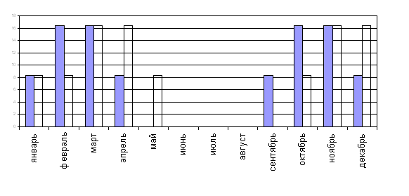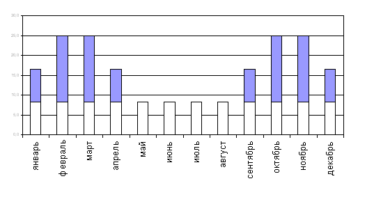 В соответствии со сказанным ранее можно выделить два пика для проведения рекламной кампании, а в остальные периоды можно осуществлять поддерживающую кампанию (либо вообще никакой). Итак, построим практический график проведения рекламной кампании ЧП Лаврентьевой. Для этого распределим все значения, показанные на графике сезонности, на три группы интервальных показателей (табл.2): наименее выгодный интервал (от 4,3 до 6,8% в месяц); средне - выгодный интервал (от 7,9 до 9,8% в месяц); самый выгодный интервал (от 10% и выше). Таблица 2. Интервалы рекламной кампании.