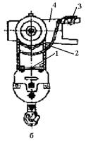 Рис. 1. Обмежувачі та вказівники вантажопідйомності: а - принципова електросхема обмежувача вантажопідйомності ОГП-1: ДУС (датчик зусилля); ДУГ (датчик кута); Т - тумблер; ПП - запобіжник; РН - реле навантаження, R1, R2, RЗ, R4 - додаткові опори; ПС-1 - ПС-2 - підстієчні опори; РВО-1, РВО-2 - реле затримки часу; РП - проміжне реле; ЛСК і ЛСЗ - червона і зелена сигнальні лампи; ЗС - звуковий сигнал; ІДУ - ланцюги управління: 1 - контакт реле РН; 2 - перевідний контакт; 3, - контакти реле РВО-1; 4, 5 - контакти реле РВО-2; 7 - 10 - контакти реле РП; б - вказівник вантажопідйомності крана, обладнаного основною або висувною стрілою; в - те ж з баштово-стріловим обладнанням: 1,7 - гвинти; 2 - шкала; 3 - мітка; 4 - паз; 5 - стрілка; 6 - стріла; 8 - блок; 9 - тросик; 10 - пружина; 11 - башта. Обмежувач та вказівник висоти підіймання стріли. Обмежувач та, вказівник висоти підіймання стріли (рис. 2) призначений для обмеження верхнього крайнього та нижнього її положення. Регулюванням обмежувача та вказівника вильоту стріли можна досягнути того, щоб при встановленні й стріли на мінімальному та максимальному вильотах спрацьовували кінцеві вимикачі. Обмежувач - вказівник повинен перевірятись щомісячно при й холостому ввімкненні стріли та після кожного монтажу крана. Надійність спрацювання обмежувача перевіряють трикратним підійманням стріли при мінімальному вильоті та опусканням стріли при максимальному. Обмежувач висоти підіймання гака (рис. 3) призначений для запобігання впирання гакової обойми в блок або стрілу і являє собою пристрій, котрий автоматично вимикає вантажну лебідку під час підходу гака до блока головки стріли. Обмежувач встановлюється на головці стріли. Принцип дії: в головній частині стріли встановлено кінцевий вимикач, важіль 2 котрий під дією упора 1 вимикає струм. При цьому ланка кінцевого вимикача замкнена. При підійманні гака понад припустиму висоту упор гакової обойми піднімає важіль і ланка розмикається. Принцип роботи обмежувача, котрий встановлюється на барабанні лебідки, базується на відліку обертів барабана під час навивання каната.
