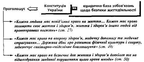Законодавство щодо безпеки життєдіяльності включає законодавство України і=> про охорону здоров'я, => про охорону праці, про дорожній руху про цивільну оборону, '=> про охорону навколишнього середовища тощо. Основи законодавства України про охорону здоров'я від 19 листопада 1992 р. із змінами і доповненнями, внесеними законами України, проголошують, що кожна людина має природне невід'ємне і непорушне право на охорону здоров'я. Суспільство і держава відповідальні перед сучасним і майбутніми поколіннями за рівень здоров'я і збереження генофонду народу України, забезпечують пріоритетність охорони здоров'я в діяльності держави, поліпшення умов праці, навчання, побуту і відпочинку населення, розв’язання екологічних проблем, вдосконалення медичної допомоги і запровадження здорового способу життя. Основи законодавства України про охорону здоров'я визначають правові, організаційні, економічні та соціальні засади охорони здоров'я в Україні, регулюють суспільні відносини у цій галузі з метою забезпечення гармонійного розвитку фізичних і духовних сил, високої працездатності і довголітнього активного життя громадян, усунення факторів, що шкідливо впливають на їх здоров'я, запобігання д захворюваності, інвалідності та смертності і зниження їх рівня, поліпшення спадковості. Законодавство України про охорону здоров'я базується на Конституції України і складається з цих Основ та інших прийнятих відповідно до них актів законодавства, що регулюють суспільні відносини у галузі охорони здоров'я. Закон України "Про забезпечення санітарного та епідемічною благополуччя населення" від 24 лютого 1994 року і із змінами і доповненнями регулює суспільні відносини, які виникають у сфері забезпечення санітарного та епідемічного благополуччя, визначає відповідні права і обов'язки державних органів, підприємств, установ, організацій та громадян, встановлює порядок організації державної санітарно-епідеміологічної служби і здійснення державного санітарно-епідеміологічного нагляду в Україні. В статті 1 визначено, що санітарне та епідемічне благополуччя населення - оптимальні умови життєдіяльності, що забезпечують низький рівень захворюваності, відсутність шкідливого впливу на здоров'я населення факторів навколишнього середовища, а також умов для виникнення і поширення інфекційних захворювань. Закон України "Про охорону праці" від 14 жовтня 1992 року визначає основні положення щодо реалізації конституційного права громадян на охорону їх життя і здоров'я в процесі трудової діяльності, регулює за участю відповідних державних органів відносини між власником підприємства, установи і організації або уповноваженим ним органом і працівником з питань безпеки, гігієни праці та виробничого середовища і встановлює єдиний порядок організації охорони праці в Україні. У статті 1 проголошується: "Охорона праці - це система правових, соціально-економічних, організаційно-технічних, санітарно-гігієнічних і лікувально-профілактичних заходів та засобів, спрямованих на збереження здоров'я і працездатності людини в процесі праці". Дія Закону поширюється на всі підприємства, установи і організації незалежно від форм власності та видів їх діяльності на усіх громадян, які працюють, а також залучені до праці на цих підприємствах. У разі, коли міжнародними догов