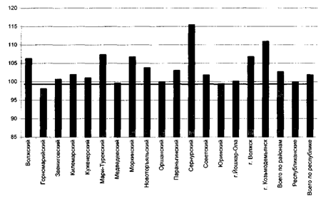 Рис.2.2. Заболеваемость детей на 1000 детского населения Наиболее высокий уровень заболеваемости детского населения в г. Йошкар-Оле (показатель 1873,6) и Килемарском районе (показатель 1735,6 на 1000 детей). Заболеваемость подростков 15-17 лет в 2004 г. возросла на 1% и составила 1074 на 1000 подросткового населения (по РФ в 2003 г. - 934,3). Структура заболеваемости подростков: первое место - болезни органов дыхания (45,5%), второе - травмы и отравления (9,4%), третье - болезни кожи и подкожной клетчатки (8,5%), четвертое место - костно-мышечной системы (6,6%). Заболеваемость подростков в 2004 г. по сравнению с 2003 г. увеличилась почти по всем классам заболеваний, снижение отмечается только по болезням органов дыхания и врожденным аномалиям развития. Министерством здравоохранения Республики Марий Эл совместно с заинтересованными министерствами и ведомствами был организован летний отдых детей. Всего на базах детских санаториев системы Минздрава оздоровлено 3785 детей, из них 424 - в возрасте от 15 до 18 лет с хроническими заболеваниями органов дыхания, опорно-двигательного аппарата, сердечнососудистой системы. На базе Республиканской больницы восстановительного лечения с детским санаторным отделением «Кичиер» организованы специализированные смены для детей с аллергическими заболеваниями. Впервые организованы смены для подростков с ортопедической и неврологической патологией и для детей-инвалидов с сахарным диабетом. Совместно с Республиканским фондом социального страхования проведены две оздоровительные смены на базе профилактория «Кооператор» для детей с заболеваниями органов дыхания и опорно-двигательного аппарата. В 2005 году эта работа будет продолжена. Совместно с Министерством социальной защиты населения и труда Республики Марий Эл на базах семи лечебно-профилактических учреждений проведено оздоровление детей и подростков с хроническими заболеваниями; На базе Республиканского центра реабилитации детей-инвалидов «Таир» организована смена для детей-инвалидов с аллергическими заболеваниями. В санаториях федерального подчинения оздоровлено 399 детей. Всего охвачено санаторным лечением и реабилитацией на базах санаториев, лечебно-профилактических учреждений 7758 ребенка (без учета летнего оздоровления детей в лагерях), что составляет 15,4% от диспансерной группы. Важным разделом деятельности была работа по обеспечению населения амбулаторно-поликлинической помощью. Утвержденный норматив объемов амбулаторно-поликлинической помощи по Программе госгарантий на 2004 г. составляет 8924,5 посещений на 1000 жителей. Всего за 2004 год зарегистрировано 6 млн.459,4 тысяч врачебных посещений (в 2003 г. - 6 млн.414,4 тыс. посещений). Фактическое число посещений за 2004 год на 1000 жителей (за счет всех источников финансирования) составляет 8609,4 (или 8,6 на 1 жителя), что выше показателя 2003 г. - 8494,8. За счет бюджета и средств обязательного медицинского страхования число посещений к врачам за 2004 г. составляет 6092,0 тысяч или 8119,4 на 1000 жителей. Утвержденный норматив объемов стационарной помощи по Программе госгарантий обеспечения граждан в Республике Марий Эл бесплатной медицинской помощью составляет на 2004 г.3140,7 койко-дней на 1000 жителей (при средней длительности госпитализации 14,3 дня). Фактически показатель стационарной помощи в 2004 г. по Программе госгарантий составляет 3444,5 койко-дней на 1000 жи