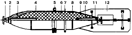Фугасная бомба; 1 - взрыватель; 2 - переходная втулка; 3 - детонаторная шашка; 4 - корпус; 5 - бугель; 6 - взрывчатое вещество; 7 - дно; 8- стабилизатор. Основные типы отечественных фугасных авиабомб были разработаны в НИО-67* в начале 1930-х гг. В 1931-1932 гг. были спроектированы фугасные авиабомбы калибра 50, 100, 250, 500 и 1000 кг. В 1934 г. была принята на вооружение ВВС разработанная в НИО-67 фугасная авиабомба ФАБ-2000. Фугасные авиабомбы ФАБ-50 и ФАБ-70 представляли собой 152-мм и 203-мм фугасные снаряды от устаревших орудий с приваренными стабилизаторами. Перед войной в целях экономии дефицитного металла по предложению профессора Н. И. Гальперина в руководимом им КБ № 35 НКБ разработали серию фугасных авиабомб в корпусах из тонкостенного железобетона (ФАБ-100НГ, ФАБ-250НГ, ФАБ-500НГ и ФАБ-1000НГ). Испытания этих изделий удачно завершились в июне 1941 г. Еще до начала войны фугасные авиабомбы в железобетонных корпусах приняли на вооружение ВВС. В первые годы войны также железобетонные корпуса изготовляли на Павшинском заводе под Москвой.