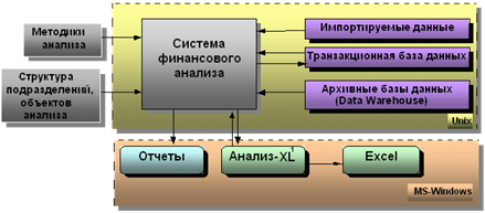 Рис.1. На рисунке 1 изображена схема взаимодействия различных компонентов Системы Анализа. Такая организация структуры предоставляет возможность проводить анализ деятельности корпоративного предприятия любой направленности, не обязательно банковской. Для этого лишь необходимо ввести в Систему методики анализа, учитывающие специфику данного предприятия. Если средств, предоставляемых Системой Анализа, оказывается недостаточно для детального или специального анализа, то эта проблема довольно просто решается в силу открытости системы для внешних приложений. Данные просто переносятся в Excel и потом могут быть обработаны любым программным пакетом для статистической обработки данных или финансового анализа. Система анализа объединяет в себе физическую структуру, хранящую данные, логическую структуру организации доступа к данным, средства задания методик анализа и форм отчетов, а также ряд сервисных функций, таких, как импорт-экспорт данных, интерфейс обмена с Excel, возможность доступа к архивным базам данных и другие. Она реализует единый подход к хранению и обработке данных различной структуры, причем не последнюю роль играет простота доступа к ним, скорость обработки информации и спектр операций манипулирования данными, которые должны включать как типичные операции, так и специальные, определяющиеся типом хранимых данных. Вся система анализа базируется на двух таблицах базы данных, одна из которых хранит информацию об измерениях, а вторая только значения показателей и ссылку на соответствующие ей значения измерений. Все данные, независимо от их экономического смысла, источников получения и свойств лежат в единой структуре данных. Вследствие этого все операции по доступу к данным, их обработке, детализации, агрегации, просмотру, валидации предельно унифицированы, что положительно влияет на скорость их проведения. Предельно облегчается репликация данных, а также доступ к ним посредством SQL-запросов и запросов, специально организованных средствами Системы Анализа. Кроме того, достаточно просто организуется анализ данных методами, применяющими подход slice & dice, то есть просмотр данных в различных разрезах, комбинациях и порядке следования. 1.2 Логическая структура организации данных для анализа и хранения Логическая организация Системы, предназначенной для анализа разнородной информации, базируется на трех типах иерархических объектов: Временные периоды. Иерархические отношения этого типа объектов носят вложенный характер. Для реализации данной системы он представляет собой ряд Год Квартал Месяц Декада Пятидневка День. Данные, лежащие на более высоком уровне, должны соответствовать детализированным данным по более низким уровням иерархии. Подразделения или объекты анализа. Их иерархическая структура определяется сложной структурой, которая характерна для предприятий корпоративного типа. В Системе Финансового Анализа основным анализируемым объектом будет, несомненно, банк с филиальной сетью: Весь банк Группа филиалов Филиал, а второстепенными могут быть другие банки, биржи или предприятия. Возможна и более глубокая детализация объектов анализа. Наиболее важную для организации логической связанности данных в системе анализа играет Иерархический справочник Типов данных, который имеет сложную древови