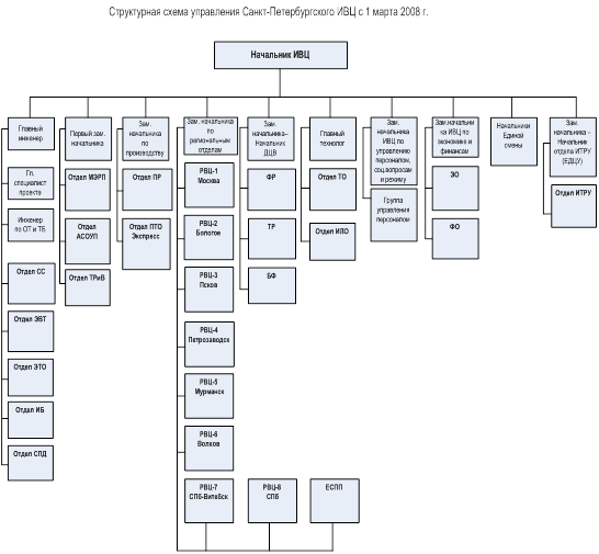 профессиональной подготовки, переподготовки и 1.4 Об отделе РВЦ-8 С-Пб ИВЦОБЩИЕ ПОЛОЖЕНИЯ-Отдел РВЦ-8 СПб ИВЦ организован приказом начальника дороги № 129/ИВЦ от 08.07.2005г, является структурным подразделением Санкт-Петербургского информационно-вычислительного центра и содержится за счёт централизуемых ГВЦ источников финансирования. - Отдел находится в непосредственном подчинении заместителя ИВЦ по региональным отделам, а по вопросам производственной деятельности подчиняется заместителям начальника ИВЦ по направлениям работы. - Отдел возглавляет начальник отдела. Начальник отдела назначается и освобождается от должности приказом начальника центра. -Сотрудники отдела назначаются и перемещаются на должность и освобождаются от занимаемой должности приказом начальника ИВЦ по представлению начальника отдела. - Отдел в своей деятельности руководствуется приказами и указаниями ИВЦ, ГВЦ, ЦКИ Специализация отдела: - техническое обслуживание вычислительной техники, установленной на станциях и линейных предприятиях (подразделениях) Октябрьской железной дороги в зоне ответственности отдела: НОД-3 и его структурные подразделения на участках в границах от Санкт-Петербурга до: Новгород-на-Волхове вкл., Окуловка вкл., Будогощь искл., Пороги искл., Пупышево искл, Бусловская вкл., Светогорск вкл., Элисенваара вкл., пользователей в филиалах ОАО «РЖД». - внедрение и сопровождение типовых автоматизированных систем (АС) и автоматизированных рабочих мест (АРМ) оперативного управления перевозочным процессом, на станциях и линейных предприятиях (подразделениях) Октябрьской железной дороги, находящихся в зоне ответственности отдела. - Производственная деятельность отдела в установленных границах строится на тесном взаимодействии со структурными подразделениями дороги, филиалами ОАО «РЖД» в соответствии с родом их деятельности. - Состав и численность отдела определяется штатным расписанием, утверждённым начальником ИВЦ, ГВЦ. -Работа отдела организуется по планам, утверждаемым руководством ИВЦ, ГВЦ. ОСНОВНЫЕ ЗАДАЧИ. - Отдел РВЦ-8 осуществляет указанные ниже виды производственной деятельности как структурное подразделение СПб ИВЦ по техническому обслуживанию, внедрению и сопровождению программно-технических комплексов в технологическом режиме и строится на делении территории Октябрьской дороги на регионы. -Выполнение предусмотренных планом работ мероприятий по внедрению новых технологий, комплексной автоматизации работ линейных структурных подразделений дороги в границах закрепленного региона. -Внедрение новейших достижений науки, техники и передового опыта. -Обеспечение бесперебойной работы техники и организация её ремонта, а также технического обслуживания ПЭВМ в структурных подразделениях региона обслуживания. -Подбор и воспитание кадров отдела, организация их труда. СТРУКТУРА ОТДЕЛА. Отдел состоит из следующих функциональных групп: - группа обслуживания станций/предприятий направления НОД-3 Московский - группа обслуживания станций/предприятий направления НОД-3 Финляндский - группа обслуживания управления ОЖД - группа оперативных АРМ - группа оперативного обслуживания (дежурная смена) - группа обслуживания ЭКСПРЕСС ФУНКЦИИ ГРУПП - Группа обслуживания станций/предприятий направления НОД-3 Московский иНОД-3 Финляндский, 