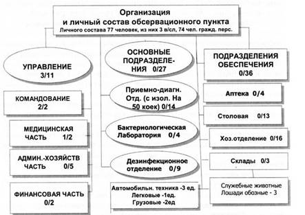 Здания (помещения) для обсервационного пункта отводятся заблаговременно в мирное время вблизи от железнодорожных станций (железнодорожных разъездов, веток), порю» пристаней, аэродромов, стратегических автомобильных дорог и приспосабливаются в соответствии с общими требованиями, установленным и дли СФЗ. При этом следует обратить внимание на то. что при отводе зданий под обсервационные пункты (.тля размещения его структурных подразделений), также должны предусматриваться здания и помещения для временного размещения (на 2000 человек) воинских контингентов подлежащих обсервации. Организация комплектования обсервационного пункта медицинским и обслуживающим персоналом осуществляется в порядке, определенном дли всех специальных формировании здравоохранении. Порядок обсервации. Обсервации подвергаются воинские контингенты, следующие по железнодорожным, водным и воздушным путям сообщения, при наличии среди них более 1% однородных или 5% разнородных инфекционных заболеваний, а также при обнаружении среди них хотя бы одно: о случая чумы, оспы и других, опасных высококоптагиозных заболевании. Воинские контингенту подлежат обсервации распоряжением командующего войсками военного округа, по территории которого следуют воинские транспорты, по представлению начальника медицинской службы на основании донесений начальника эшелона, командира воздушного, морского судна, начальника аэродрома, аэропорта, порта. Распоряжение о задержке воинского транспорта и направление его на обсервацию дается коменданту станции (аэропорта, порта) и начальнику гарнизона. Одновременно ставится в известность соответствующий орган исполнительной власти субъекта Российской Федерации, его орган управления здравоохранением и эвакуационный пункт (местный или распределительный), к которому приписан обсервационный пункт. Орган управления здравоохранением субъекта Российской Федерации при получении распоряжения о необходимости обсервации воинских контингентов приводи т обсервационный пункт в состояние готовности к работе. Для приема эшелона на обсервацию назначается комиссия в составе: представителя штаба военного округа военного времени, начальника обсервационного пункта, гарнизонного врача, начальника эшелона, врача эшелона и представители органа управления здравоохранением субъекта Российской Федерации, Комиссия составляет акт в двух экземплярах о санитарно- эпидемиологическом состоянии эшелона, один из которых остается у начальника обсервационного пункта, а второй пересылается в медицинскую службу военного округа (фронта). Одновременно комиссия делает соответствующую запись в паспорт эшелона о санитарно-эпидемиологическом состоянии перевозимых контингентов. После приема воинского эшелона на обсервацию производится медицинский осмотр всего обсервируемого личного состава с привлечением медицинского состава эшелона. Инфекционные больные (с выраженной клиникой заболевания) направляются в стационарные лечебные учреждения, выделяемые для этой цел и органом управлении здравоохранением субъекта Российской Федерации. Больные с подозрением на инфекционное заболевание помещаются в изолятор. Весь остальной личный состав эшелона подвергается полной санитарной обработке, после чего размешается в специально предназначенных