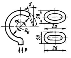 Таким образом, видно, что погрешность от допуска на изготовления толщины мембраны зависит от измеряемого давления, т.е. является мультипликативной 2.2 Измерение давления трубчато – пружинным деформационным манометром В трубчато-пружинном манометре однотрубная пружина радиусом R0 с первоначальным углом закручивания α = 270° и параметрами поперечного сечения а и b, выполнена из материала с модулем упругости ЕG. Требуется: 1. Изобразить схему пружинно-трубчатого манометра 2. Определить изменения угла закручивания и угла перемещения конца пружины при заданном наибольшем давлении рmах. 3. Определить погрешность измерений, если диаметр трубки D0 выполнен с допуском ±1,0 мм. 4. Назначить класс точности манометра, с учетом запаса точности 2,5. Решение Исходные данные сводим в табл. 2.2. Таблица 2.2 Исходные данные