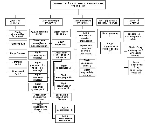 Рис 1.5. Структура ХФ АКІБ “УкрСиббанк” “ХРУ” Постійно працюючи в напрямку найбільш комплексного обслуговування клієнтів, банк істотно розширив спектр послуг, які надаються на ринку цінних паперів з інкасування, доміціляції та ввалювання векселів, шляхом розробки і проведення індивідуальних розрахункових схем своїх клієнтів. Банк продовжує оптимізувати набір кредитних продуктів, які пропонуються. У 2009 році готуються до впровадження: передекспортне фінансування, форфейтинг, мікрокредитування та інші види кредитних продуктів, які дозволятимуть і в майбутньому дотримуватися принципів індивідуального підходу, гнучкої цінової політики, оптимізації витрат позичальника в роботі зі своїми клієнтами (рис. 1.6).
