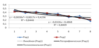 Если расчеты выполнены, верно, то Полученные уравнение показывает, что наблюдается тенденция снижения риска: с 2003г. по 2010г. величина риска в среднем снижалась на 2*0,001=0,002 пункта в год. Фактические и расчетные значения величины риска представлены в виде графика (рисунок 8).
