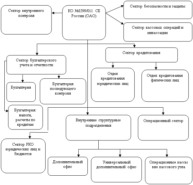 При Совете создаются два комитета - кредитный и ревизионный. Ревизионный комитет занимается проверкой соблюдения законодательных актов, проведением сплошных и выборочных проверок кредитных, расчетных и других операций. Кредитный комитет разрабатывает кредитную политику банка, структуру привлекаемых средств и возможности их размещения. Право подписи имеет управляющий отделением, его заместитель и главный бухгалтер, которые назначаются на должность и освобождаются от должности председателем Уральского банка СБ РФ. Оформляют обеспечения кредита и договора, составляют заключения; проводят мониторинг предоставленных кредитов; осуществляют формирование и корректировку резерва на возможные потери по кредитам; контролируют своевременность погашения кредитов, принимают меры к погашению просрочки; ведут постоянный анализ кредитного портфеля отделения. В состав сектора кредитования входит юрисконсульт. Его деятельность определяется целями обеспечения законности и правовых гарантий в деятельности банка, защиты его прав и интересов правовыми средствами. Сектор бухгалтерского учета и отчетности осуществляет последующие проверки состояния бухгалтерского учета и отчетности во внутренних подразделениях отделения; контроль выполнения предложений внутренними подразделениями по результатам проверок. Работники сектора подводят итоги финансово-хозяйственной деятельности по отделению, составляют периодическую отчетность, осуществляют контроль погашения убытков и другие операции. Начальником сектора является главный бухгалтер. Его основная обязанность - обеспечивать сохранность бухгалтерских документов, подписывать документацию денежного, материально-имущественного и расчетного характера. Деятельность операционного сектора осуществляется на основе устанавливаемых отделением плановых заданий. Сектор осуществляет работы по привлечению клиентов в банк, по продаже банковских продуктов и услуг, по проведению контроля операций клиентов. Сектор расчетно-кассового обслуживания (РКО) занимается организацией операций по открытию и ведению текущих, расчетных, бюджетных счетов юридических лиц. Сектор безопасности и защиты осуществляет мероприятия по обобщению, обработке и анализу информации о физических и юридических лицах, вступающих в финансово-кредитные отношения с отделением; участвует в проведении расследований и осуществлении мероприятий по возврату просроченной ссудной и дебиторской задолженности. Сектор кассовых операций и инкассации обеспечивает обобщение и анализ показателей, характеризующих состояние кассовой и инкассаторской работы в отделении; обобщает и анализирует объемы перевозок ценностей и финансовый результат деятельности сектора. Работники сектора проводят маркетинговые исследования рынка банковских услуг и готовят предложения по изменению действующих тарифов на услуги, оказываемые клиентам; организуют маркетинг и привлечение корпоративных клиентов. КО №8599/011 СБ России (ОАО) и универсальный дополнительный офис осуществляют свою деятельность как внутренние структурные подразделения ОСБ, расположенные вне его местонахождения; совершают с клиентами следующие банковские операции и сделки: открытие, закрытие и ведение банковских счетов физических лиц; операции с расчетными ч