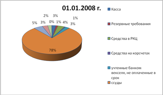 Из анализа бухгалтерского баланса АКБ «Инвестторгбанк» (ОАО) видно, что возросла доля активов, динамика которых составила 56,35%. Это изменение произошло за счет увеличения кассовых активов, наибольший удельный вес в которых составляют средства в РКЦ, на 01.01.2008 г. 4,14% от актива баланса . На 01.01.2007 г. они составляли 631681 тыс. рублей, на 01.01.2008 г. 1105908, т.е увеличились на 75,07% по показателям динамики. Также произошел небольшой рост кассы на 01.01.2008 г. она составила 2.43%, увеличилась на 264288 тыс. рублей или на 68,68% по сравнению с прошлым периодом. Увеличение актива в анализе баланса произошло также и за счет ссуд, их изменения в структуре составили 0,90%. На 01.01.2007 г. они составляли 13112972 тыс. рублей, на 01.01.2008 г. 20742038 тыс. рублей, т.е. увеличились на 58,18%. Это говорит о том банк проводит эффективную кредитную политику. Прочие активы банка увеличились по сравнению с прошлым периодом на 1298415 тыс. рублей- это 75,51%, показатель на 01.01.2008 г. составил 11,31% от актива баланса. Наибольший удельный вес показали прочие активы, на 01.01.2008 г. 2,37%. На 01.01.2007 г. они составляли 175645 тыс. рублей, на 01.01.2008 г. 631894 тыс. рублей, т.е. увеличились на 259,76% по показателям динамики. Также значительно увеличились отвлеченные средства, расходы и убытки, на 01.01.2008 г. они составили 0,22% от актива. На 01.01.2007 г. они составляли 6303 тыс. рублей, а на 01.01.2008 г. составили уже 67644 тыс. рублей, т.е. увеличились на 973,20% по динамике по сравнению с прошлым периодом. Графически структура активов представлена на (Рисунке 2.1).