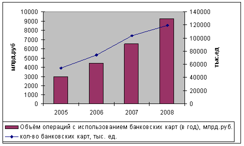 Рис. 4 - Количество банковских карт и объем операций с их использованием[7] Несмотря на достаточно высокие темпы прироста количества банковских карт и объема операций, совершаемых с использованием платежных карт (в 2008 г. они составили 15,2 и 41,6 % соответственно). В заключение хотелось бы отметить, что наличное денежное обращение остается важнейшей составной частью экономики страны и основой социальной стабильности. Увеличение наличного денежного оборота носит объективный характер и зависит от динамики основных макроэкономических показателей: ВВП, денежных доходов населения, оборота розничной торговли, индекса потребительских цен, обменного курса; а также связано с изменением Банком России методов регулирования количества наличных денег в обращении. В условиях развития информационных технологий возможности для расширения безналичных расчетов в сфере личного потребления имеются. Однако внедрение электронных средств платежа для оплаты товаров и услуг происходит постепенно, исходя из потребностей хозяйствующих субъектов. Таким образом, как свидетельствует анализ, наличные деньги в обозримом будущем сохранят свое доминирующее положение при расчетах населения за товары и услуги. Вхождение России в сферу карточных технологий пришлось на начало 90-х гг., и сегодня рынок пластиковых карт является одним из самых динамичных направлений банковской деятельности. Если раньше наиболее популярным для населения способом вложения средств было хранение накоплений на вкладных счетах, то в последние годы вследствие снижения уровня доходов у большинства вкладчиков банковские продукты, направленные на привлечение средств физических лиц, стали менее востребованными. Теперь клиенты, разместив средства на банковских счетах, хотят иметь возможность получить их в любой момент, и пластиковые карточки предоставляют им эту возможность. Платежная система представляет собой ассоциацию банков и компаний, работающих по общим правилам использования карточек. Основу платежной системы составляет совокупность нормативных, договорных, финансовых и информационно-технических средств, а также решений участников, которые регламентируют свои взаимоотношения относительно порядка использования карточек. В платежной системе существуют несколько статусов членства: полное, частичное и т.д. Все карточки, которые принадлежат к одной платежной системе имеют признаки, позволяющие идентифицировать их принадлежность к этой платежной системе. К современным платежным системам относятся VISA International, MasterCard International, American Express, Diners Club International, JCB International, которые значительно отличаются как по числу банков-участников, так и по количеству эмитированных платежных карточек. VISA International на настоящий момент является самой крупной международной платежной системой, как по количеству карточек, так и по оборотам. Международная платежная система построена по принципу ассоциации финансовых организаций из различных стран. Организационный принцип - бездоходная корпорация, зарегистрированная в США, в штате Делавар. Члены ассоциации одновременно являются ее совладельцами: более 19 тысяч членов - крупнейших мировых финансовых организаций. Управляющий орган - Совет Директоров, выбираемый из числа наиболее активных членов (в зависимости от объема операций и числа выпущен