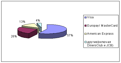 Как видно из проведенного сравнительного анализа в Таблице 1, каждая система обладает определенными достоинствами и недостатками, поэтому клиенты могут выбирать платежные карточные системы по функциям, которые их устраивают. Таким образом, на основании проведенного в данной главе исследования теоретических аспектов пластиковых карт, можно сделать вывод о том, что пластиковая карточка – обобщающее понятие для документа различных видов расчетных систем. В зависимости от вида используемых счетов и механизма расчетов карточки подразделяются на дебетовые и кредитовые. Наиболее широко используются кредитные карты международных кредитно-финансовых групп: Visa, MasterCard, американских Америкен-экспресс, также известны кредитные карты EuroCard. Основными видами карточек являются: банковские кредитные карточки, карточки туризма развлечений и отдыха, частные платежные карточки предприятий торговли и услуг, карточки для банковских автоматов, дебетовые карточки частных сетей, чековая гарантийная карточка. Наибольшей популярностью среди пользователей пластиковых карт в Российской Федерации пользуются международные пластиковые карты ViSa (40%) и Europay (25%), которые принимаются по всему миру в более чем 120 странах мира. Все расчеты по операциям с использованием банковских карт, совершаемые на территории Российской Федерации осуществляются только в валюте Российской Федерации – рублях на основании заключенного договора между банком и контрагентом (физическое или юридическое лицо). От исследования теоретических основ рынка пластиковых карт перейдём к практическому изучению и анализу данного рынка. 2. ОЦЕНКА ИСПОЛЬЗОВАНИЯ ПЛАСТИКОВЫХ КАРТ 2.1 Анализ рынка пластиковых карт в России В условиях развития мирохозяйственных связей происходит процесс интеграции экономик отдельных государств и развития платежных систем, в частности, в направлении развития безналичных форм расчетов, которые, в свою очередь, нашли широкое применение в современном мире. Одним из инструментов безналичных расчетов является пластиковая карта. В большинстве экономически развитых стран пластиковая карта является неотъемлемым атрибутом сферы торговли и услуг. Проведение операций с помощью платежных карт показывает степень интегрированности банковской системы и общества. Достаточно сказать, что безналичная оплата товаров и услуг в промышленно развитых странах достигает 90% в структуре всех денежных операций. В настоящее время пластиковый бизнес - это более 1,3 млрд. выпушенных карт. Ежегодный мировой оборот превышает 3 трлн. долл. Платежные карты принимаются более чем 20 млн. торгово-сервисных предприятий. Около полумиллиона банковских отделений, предоставляющих услуги, проводят операции с платежными картами, а число банкоматов превысило 700 тыс. Наряду с локальными (национальными) системами всё более широкое развитие получают международные системы расчетов с использованием платежных карт. Основная часть мирового рынка пластиковых карт контролируется двумя крупнейшими компаниями - Visa International и MasterCard International. Если разделить весь мировой рынок пластиковых карт на сферы влияния основных игроков - платежных систем, то получится следующая картина: на платежную систему Visa приходится около 57%, на Europay/MasterCard примерно 26%, на American Express - порядка 13%, и на другие (включая Diners