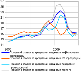 Рис. 9. Процентні ставки за кредитами. У той же час спостерігається суттєва диференціація процентних ставок як за секторами економіки (для населення вони є вищими, ніж для нефінансових корпорацій далі НФК), так і за видами валют (у національній валюті вартість кредитів вища, ніж в іноземній). Хоча економічна активність у 2009 році пожвавилася, питання щодо вартості наданих кредитів залишилося актуальним. Тому, на наш погляд, особливої уваги потребує аналіз процентних ставок з точки зору підтримки комерційними банками сектору НФК. Зазначимо, що тут спостерігається досить значна диференціація процентних ставок: максимальними були процентні ставки за кредитами, наданими корпораціям «рибальства, рибництва» (23,3%), в той час за кредитами, наданими сільськогосподарським підприємствам 15,7% (рис. 10).