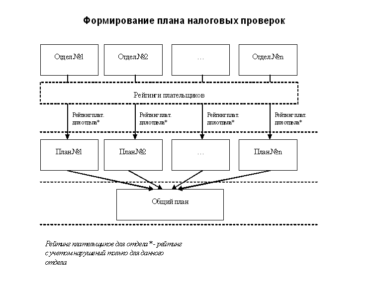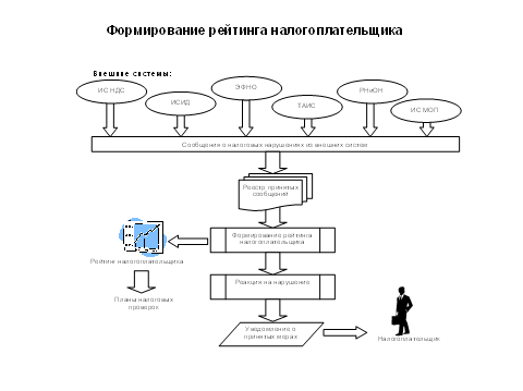 Рисунок №4 После принятия сообщения о налоговом нарушении, в ИС ЭКНА выполняется автоматический анализ принятого сообщения, в соответствии с критериями оценки. Каждое выявленное налоговое нарушение может быть отнесено к одной из групп: ФЛК; камеральный контроль; отдельные сведения (систематическая убыточность, низкий коэффициент налоговой нагрузки и другие). Для анализа нарушений используется система формирования рейтинга – степени «тяжести» нарушения. Следует различать две составляющие рейтинга налогоплательщика: рейтинг по налоговым нарушениям; коэффициент приоритета, выставляемый по регистрационным данным (по умолчанию равен 1). Рейтинг по налоговым нарушениям из различных информационных систем для каждого налогоплательщика суммируется. Наряду с рейтингом налогоплательщика, рассчитывается предполагаемая сумма доначислений по акту налоговой проверки, на основе сообщений из внешних информационных систем о суммах отклонений, выявленных в формах налоговой отчетности. Алгоритм расчета предполагаемых сумм доначислений следующий: · на основе информации, переданной внешней информационной системой, определяется форма налоговой отчетности, в которой установлены нарушения; · на основе справочных данных, позволяющих определить ставку налога по коду формы налоговой отчетности, рассчитывается предполагаемая сумма доначислений, равная произведению суммы отклонения на ставку налога. Высокие показатели рейтинга отражаются в реестре «Рейтинг налогоплательщиков на проверку» – это реестр, из которого в дальнейшем будут выбраны налогоплательщики в план налоговых проверок. Под планом налоговых проверок понимается документ, в соответствии с которым производится контрольная работа налогового органа. Формирование плана проверок, осуществляется путем выбора налогоплательщиков по максимальному рейтингу, формируемому на основе налоговых нарушений. [17] В соответствии с организационной структурой налогового органа, планы могут составляться несколькими отделами. Особенностью составления плана различными отделами является то, что при помощи справочника «Налоговые нарушения, контролируемые отделами» план может формироваться только по определенным группам нарушений.