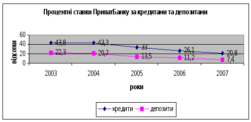 Графік 2.1. Динаміка процентних ставок за 2003–2007 роки У 2005 році середня процентна ставка за депозитами становила 13.5, у 2006 р. – 9.9, у 2007 р. – 7.4%. Зниження процентних ставок – один із чинників зменшення процентних витрат банку Функціонування та розвиток банку в 2007 році характеризувалися підвищенням фінансової стабільності, рівня капіталізації банку, поліпшенням якості активів, зменшенням ризиків у банківській діяльності, а також наявністю позитивних структурних змін в активах, зобов'язаннях, капіталі банку. Триватиме й позитивна тенденція до підвищення рівня капіталізації, передусім – за рахунок збільшення статутного капіталу відповідно до вимог Закону України «Про банки і банківську діяльність» та нормативно правових актів НБУ, що дасть змогу банку збільшити свій капітал. Структура кредитування залишиться досить стійкою. Основну частку кредитів становитимуть позички, надані суб'єктам господарювання, збільшуватиметься питома вага довгострокових кредитів, а також позичок, наданих населенню. У структурі залучених коштів очікується збереження тенденцій до: швидкого зростання обсягів залучених коштів фізичних осіб, збільшення терміну зберігання. забезпечення довіри кредиторів і вкладників до банку шляхом підвищення стабільності, стійкості й конкурентоспроможності на ринку, спроможної максимально та якісно задовольнити потреби економіки й населення у кредитах та інших сучасних банківських послугах. 2.3 Аналіз фінансової діяльності та кредитного портфелю банку Результативним показником діяльності банку є величина одержаного прибутку. У 2007 році чистий прибуток банку становив 31,1 млн. грн. Варто виділити джерела зміни чистого прибутку: збільшення чистого комісійного прибутку банку на 34 млн. грн. переважно пов’язане з розширенням спектру пропонованих послуг та інтенсивним розвитком торговельної мережі банку; зменшення відрахувань у страхові резерви у 2007 році викликано поліпшенням якості портфеля активів і зниженням темпів приросту кредитного портфеля, що привело до збільшення чистого прибутку банку порівняно з 2005 роком на 4,6%. збільшення чистого торгівельного прибутку від спекулятивних операцій з цінними паперами на суму 55,6 млн. грн.; зменшення торговельного прибутку від операцій з валютою на суму 18,8 млн. грн.; збільшення операційних витрат банку на 217,6 млн. грн. через розширення сфери присутності банку – як територіальної, так і продуктової; Розглянемо результати діяльності банку. Прибуток від кредитних операцій є вагомою статтею прибутків, отриманих ЗАТ КБ «ПриватБанк». При цьому слід зазначити, що банком досягнуто покращення показників структури операційних прибутків. Так, у 2003 році скорочено частку чистого процентного доходу в операційних прибутках банку, що обумовлено випереджуючим зростанням чистого комісійного доходу стосовно чистого процентного доходу банку і пов’язано з активізацією діяльності в торгівлі цінними паперами. Таким чином, банком у звітному році досягнуто зниження ризику концентрації прибутків (відношення чистого непроцентного доходу до операційних доходів збільшилося на 9,8%: з 38,6% у 2006 році до 49,4% у 2007). Джерела формування доходних / видаткових статей чистого процентного доходу наведені в таблицях 2.4 і 2.5. У 2007 році чистий процентний дохід банку становив 759 млн. грн., що на 70,61% більше, ні