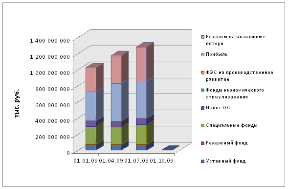 Рисунок 4. Динамика объема и структуры привлеченных средств В структурных составляющих срочных депозитных вкладов за период с 01.01.09 г. по 01.07.09 г. произошли следующие изменения: ˉ прирост срочных вкладов населения составил 131924744 тыс. руб.; ˉ величина срочных вкладов предприятий снизилась на 67445926 тыс. руб.; ˉ снижение полученных межбанковских кредитов составил 836630624 тыс. руб. Следует отметить неоднородность динамики привлеченных межбанковских кредитов, если во втором и третьем квартале наблюдалось снижение данного показателя на 45,33% и 10,08% соответственно, то в период с 01.10.08 г. по 01.01.09 г. прирост кредитов, полученных у других банков, составил 709,97% или 790 948 955 тыс. руб. Удельный вес кредитов, полученных у других банков, в пассивах банка за исследуемый период снизился с 16,2% до 3,2%. Более 20% всех привлеченных средств приходится на счета до востребования. Счета до востребования составили: на 01.01.09 г. – 1 119 102 748 тыс. руб.; на 01.04.09 г. – 1 133 527 574 тыс. руб.; на 01.07.09 г. – 1 153 251 179 тыс. руб. Наибольший удельный вес в счетах до востребования (более 53%) составляют счета негосударственных организаций. Динамика данного показателя предопределяет динамику всей группы счетов до востребования. На 01.01.09 г. на счетах до востребования негосударственных организаций в ОАО «Сбербанк» находилось 653 175 534 тыс. руб., на 01.04.09 г. – 653 208 265 тыс. руб., на 01.07.09 г. – 613 602 607 тыс. руб. За исследуемый период в структурных составляющих счетов до востребования произошли следующие изменения: ˉ величина средств на счетах до востребования государственных предприятий и организаций увеличились на 2 331 072 тыс. руб.; ˉ величина средств на счетах до востребования негосударственных организаций снизилась на 39 572 927 тыс. руб.; ˉ величина средств на счетах до востребования некоммерческих организаций увеличилась сократилась на 7 220 223 тыс. руб.; ˉ величина средств на счетах до востребования физических лиц – индивидуальных предпринимателей увеличилась на 3 408 614 тыс. руб.; ˉ величина средств на счетах до востребования физ. лиц увеличилась на 60 125 883 тыс. руб.; ˉ величина средств на счетах до востребования нерезидентов сократилась на 635 566 тыс. руб. Структура депозитной составляющей благоприятна с точки зрения ликвидности, поскольку срочные депозиты имеют в ней наибольший удельный вес. В качестве отрицательной тенденции следует отметить ощутимый рост в совокупных привлеченных средствах кредитов, полученных у других банков. На 01.01.09 г. величина долговых обязательств составила 120 756 159 тыс. руб. На 01.07.09 г. прирост данного показателя составил 7 885 957 тыс. руб. Средства из системы расчетов на 01.01.09 г. составили 69 324 589 тыс. руб., а на конец исследуемого периода – 64 293 788 тыс. руб. Общее снижение прирост данного показателя составил 5030801 тыс. руб. Удельный вес прочей кредиторской задолженности в привлеченных средствах банка на 01.01.2009г. – 6,6%, на 01.04.09 г. – 3,8%, на 01.07.09 г. – 3,7%. Снижение данного показателя за период с 01.01.09 г. по 01.07.09 г. составил 217853269 тыс. руб. Собственные средства банка на 01.01.09 г. составили 1 025 533 103 тыс. руб., на 01.04.09 г. – 1 171 877 008 тыс. руб., на 01.07.08 г. – 1 282 818 238 тыс. руб. В итоге за исследуемый период величина собственных средств банка увеличилась на 897314865 тыс. руб. или на 25,09%. Квартальные темпы прироста составили: 14,27%, 9,47%. Темп роста данного показателя значительно замедлился (см. рисунок 5). Удельный вес собственного капитала соб