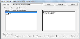 Рис. 23 dBASE IV Schema Generation Во вкладке «Options» мы указываем опции генерации таблиц, во вкладке «Summary» мы можем просмотреть включенные опции, а во вкладке «Comment» оставить комментарии. Щелкнув по кнопке «Filter…» мы можем выбрать таблицы которые будут созданы Рис. 24