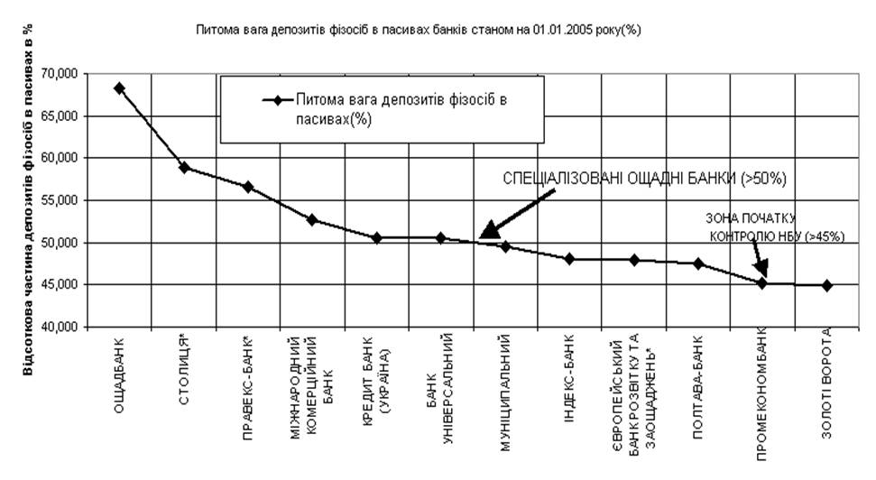 Рис.2.7 Ідентифікація лідерів депозитного ринку фізичних осіб кваліфікаційним умовам НБУ – «спеціалізований ощадний банк» станом 01.01.2005 року