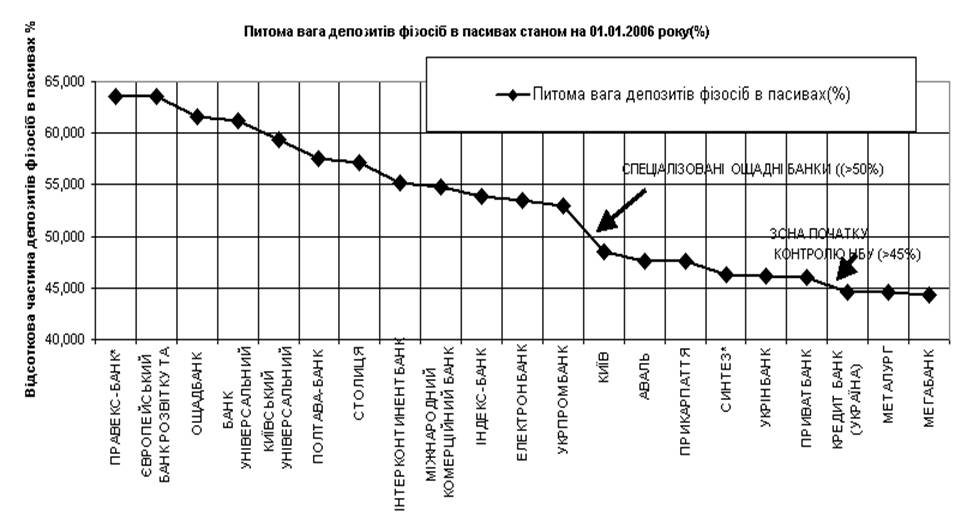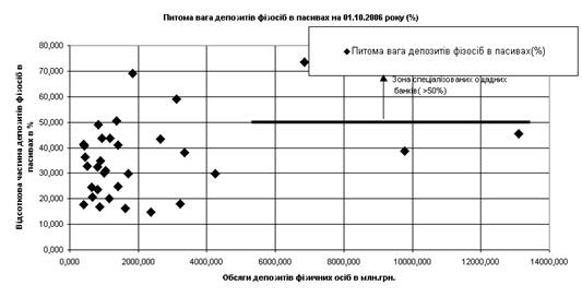 Рис.2.5 Відносна частка суми депозитів фізичних осіб в пасивах банків України, які претендують на спеціалізацію «ощадний банк» станом на 01.01.2006 року