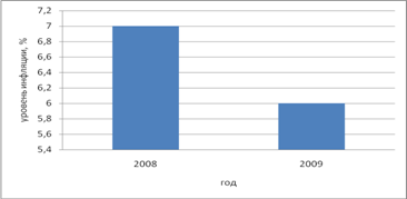 Рисунок 2 – Прогнозируемый уровень инфляции за 2008-2009 годы Фактически по итогам сентября 2009 года инфляция в годовом выражении также замедлилась и составила 5,8%, что является самым минимальным уровнем, начиная с сентября 2003 года (в декабре 2008 года – 9,5%). Данный уровень инфляции в 3,5 раза ниже максимального значения уровня инфляции за последние годы, наблюдавшегося в летние месяцы 2008 года. Цены на продовольственные товары выросли на 3,6% (в декабре 2008 года - на 10,8%), непродовольственные товары – на 6,6% (на 5,7%), платные услуги – на 8,0% (на 11,4%). Таблица 1 – Прогноз основных показателей денежно-кредитной политики на 2007 - 2009 годы (сценарий «умеренные цены на нефть при умеренном притоке капитала») на конец периода