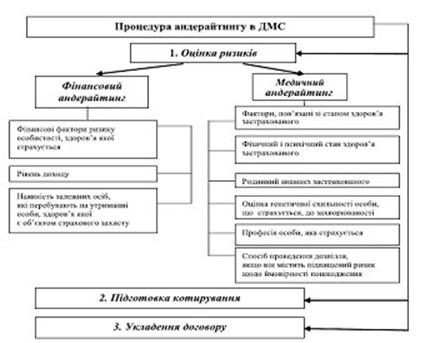 де СПН – невикористана страхова премія; ΣСПС – сума фактично сплачених страхових премій; NВВС – норматив витрат на ведення справи; nЗоп – кількість днів до закінчення оплаченого періоду; nоп – кількість днів оплаченого періоду. З урахуванням вищезазначеного, під андерайтингом у медичному страхуванні слід розуміти комплексну роботу страховика з оцінювання якісних характеристик здоров’я та фінансового стану заявника, при прийнятті на страхування ризиків, пов’язаних із втратою здоров’я, яка передбачає визначення можливості страхування, вибір оптимального покриття, перевірку відповідності ризиків і клієнтів цілям та завданням страхової компанії щодо захищеності і збалансованості її страхового/перестрахового портфеля.
