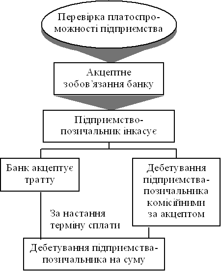 Рис. 7.7. Структурно-логічна схема акцептного кредитування підприємства кредиту є грошове покриття суми векселя позичальником до настання строку погашення векселя, банки ставлять високі вимоги до надійності підприємств. Якщо підприємство не виконало своїх зобов’язань перед банком-гарантом, банк згідно з вексельним правом виставляє зворотну вимогу до векселедавця з наступним примусовим стягненням боргу з підприємства-позичальника. За надання акцептного кредиту банк стягує акцептну комісію. У зв’язку з ненадійним фінансовим станом більшості підприємств в Україні акцептний кредит не набув широкого застосування. Може існувати інша схема надання кредиту. Наприклад, у Росії поширено практику, відповідно до якої підприємство укладає угоду з банком. Згідно з угодою підприємство отримує прості векселі, виписані банком на нього. Ця схема відрізняється від класичної. Банк фактично є боржником, а не трасатом, як у класичному варіанті, і за відмови клієнта перерахувати необхідну суму має право не регресної вимоги, а вимоги згідно з укладеною угодою. Ця схема є простішою й ефективнішою для суб’єктів господарювання. Авальний кредит — це позика, коли банк бере на себе відповідальність за зобов’язаннями підприємства у формі поручительства або гарантії. Підприємство—одержувач платежу, як і за акцептного кредиту, отримує від банку-гаранта (аваліста) умовне платіжне зобов’язання. Якщо власник векселя вносить протест у зв’язку з несплатою векселя, банк-аваліст погашає всю суму векселя за платника. За авальний кредит банк одержує комісійні, розмір яких залежить від виду вимог, що випливають з гарантії, а також терміну дії гарантії. Крім того, за наданий кредит стягується відсоток за діючими ставками. Принципова різниця між авальним та акцептним кредитами полягає у характері відповідальності банку. За надання авального кредиту, без огляду на його суть як вексельного поручительства, банк несе тільки субсидіарну (додаткову) відповідальність, тобто вимога може бути звернена на нього тільки за невиконання її підприємством. За акцептного кредиту банк несе солідарну відповідальність і вимогу, на вибір кредитора, може бути звернено як на підприємство, так і на банк. Для підприємств, які інтенсивно використовують векселі, більш еластичною формою вексельного кредиту є позики, що видаються під заставу векселів. Банки можуть відкривати підприємствам спеціальні позикові рахунки і відображати на них суму наданої позики, забезпечену прийнятими векселями. Позики оформляються без зазначення строку або до настання строку погашення векселів, що приймаються в заставу. Векселі приймаються (депонуються) як забезпечення не за їхньою повною вартістю, а за 60 — 90% їхнього номіналу залежно від кредитоспроможності підприємства, що заставляє векселі, і надійності самих векселів. Погашення позики під векселі робить саме той, хто користується кредитом, після чого банк повертає йому векселі на суму погашеного боргу. Якщо від самого підприємства гроші не надходять, то на погашення позики обертаються суми, які надходять в оплату векселів. До послуг кредитного характеру, що надаються банками підприємствам, належить факторинг — система фінансування, за умовами якої підприємство—постачальник товарів переуступає короткострокові вимоги за торговельни