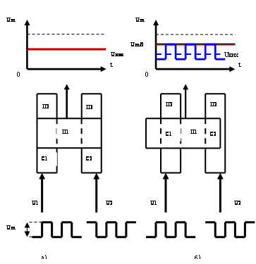 Рис .23 . Формування сигналів на виході диференційного конденсатора при нейтральному положенні рухомої обкладки а) зміщення рухомої обкладки вліво, б) зміщення рухомої обкладки вправо; в) еквівалентна схема сенсора з використанням диференційного конденсатора. Всі елементи диференційного конденсатора виготовлені з полікремнія і є хорошими провідниками в діапазоні робочих температур. На кожній з пластин диференційного конденсатора є контакт для підводу вимірювального сигналу. При відсутності зовнішнього механічного збудження (рис. 23,а) рухома частина диференційного конденсатора П1 знаходиться в середньому положенні, парціальні ємності С1 і С2, утворені кожною пластиною нерухомої обкладки (П2,П3) і рухомою обкладкою конденсатора (П1), будуть рівні між собою [1]. Еквівалентна схема сенсора з використанням диференційного конденсатора представлена на рис. 23,г. Як видно з представленої схеми, ємності С1 та С2 утворюють ємнісний дільник напруги, до середньої точки якого підключений вхід допоміжного підсилювача з вхідним опором. Коефіцієнт передачі ємнісного дільника kn в цьому випадку дорівнює 0.5. Сигнал Umax, що знімається з рухомої частини П1, представляє собою постійну напругу Um/2 (синя лінія на рис. 23,а) оскільки в першому напівперіоді вимірювального сигналу до дільника прикладені напруги U1=0 та U2=Um, а в другому напівперіоді - навпаки U1=Um та U2=0. При зміщенні сигнальної пластини П1 вліво за рахунок дії сили інерції (рис. 23,б) С1>С2, коефіцієнт ділення kn для сигналу U1 більше за 0.5, а для сигналу U2 менше, ніж 0.5, що призводить до формування на пластині П1 напруги Uвих, яка містить постійну складову, рівну Um/2, і змінну складову, по формі співпадаючу з вимірювальним сигналом U1. Амплітуда змінної складової залежить від відношення ємностей С1 і С2. Демодуляція сигналу з виходу допоміжного підсилювача здійснюється шляхом синхронного детектування, для чого в блок демодулятора в якості опорного подається один з вимірювальних сигналів, (рис. 21). Сигнал на виході блоку демодуляторів при використанні напруги U1 в якості опорного сигналу показаний на рис. 23 червоною лінією. В таблиці 2 для порівняння приведені параметри декількох акселерометрів. Параметри акселерометрів ADXL330 ADXL202/ADXL210Таблиця 2