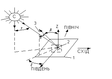 Кут падіння прямого сонячного випромінювання можна обчислити по формулі (3.2):