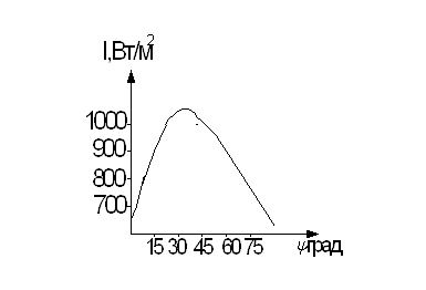 Рис. 3.5 – Розподіл інтенсивності сонячного випромінювання в залежності від сонячного часу Для інженерних розрахунків сонячних установок на рис. 3.6 приведені дані про величину сприйманої енергії сонячними установками I і П типу при оптимальній орієнтації робочих поверхонь і контрольною установкою з горизонтальним розташуванням. Для визначення сумарної кількості енергії сонячного випромінювання (прямого, розсіяного і відбитого) на оптимально зорієнтовану похилу площину доцільно використовувати рівняння (3.2, З.3), що апроксимують криву 1, приведену на рис. 3.7: