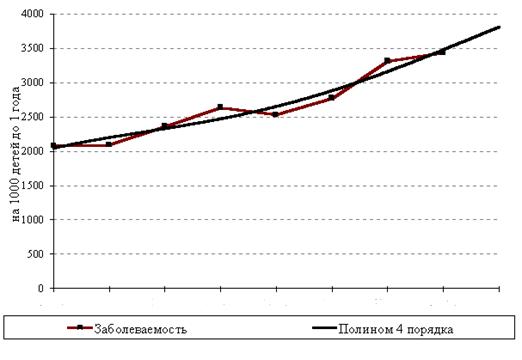 Рисунок 1. Динамика показателей заболеваемости детей в возрасте до 1 года в г. Новый Уренгой. Приложение 2 Таблица 1 Приоритетные показатели загрязнения воздуха в формировании заболеваемости детей органов дыхания в возрасте до 1 года и коэффициенты корреляции (p < 0.05).