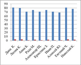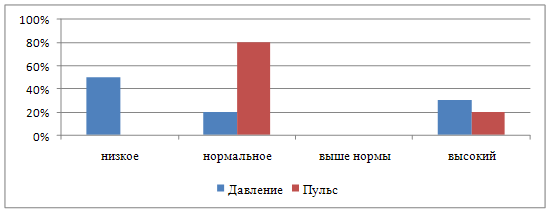 Как мы видим на рис. 2-3, 80 % испытуемых имеют пульс в норме, 20 % - высокий. Давление этих же испытуемых следующее: 50 % - низкое, 20 % - норма, 30 % - высокое. Результаты представим на рис. 4.