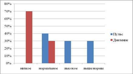 Как мы видим на рис. 5-6, 40 % испытуемых имеют пульс в норме, 30 % - высокий, 30 % - выше нормы. Давление этих же испытуемых следующее: 70 % - низкое, 30 % - норма, 0 % - высокое. Результаты представим на рис. 7.