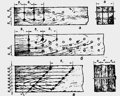 Рис. 1 Скріплення деталей за допомогою нагелів. Деталі грубих столярно-теслярських виробів скріплюють цвяхами. Діаметр цвяха повинен бути приблизно в 10 разів менший від товщини деталей; довжина цвяха повинна дорівнювати потрійній товщині верхньої деталі, а якщо цвяхи проходять на протилежний бік з'єднувальних деталей, то їх кінці загинають впоперек волокон. Якщо діаметр цвяха більший, ніж 6 мм, то його забивають у попередньо просвердлений отвір 0,9 діаметра цвяха, що забивають і глибиною не менше 0,6 довжини цвяха. Відстань між осями цвяхів" забитих у з'єднувальні деталі, показана на рис. 2, в.