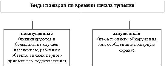 + + = Отсутствие одного из перечисленных элементов делает невозможным возникновение пожара или приводит к прекращению горения и ликвидации пожара. По масштабам и интенсивности пожара можно подразделить на: отдельный пожар, возникающий в отдельном здании (сооружении) или в небольшой изолированной группе зданий; сплошной пожар, характеризующийся одновременным интенсивным горением преобладающего количества зданий и сооружений на определенном участке застройки (более 50 %); огневой шторм – особая форма распространения сплошного пожара, который образуется в условиях восходящего потока нагретых продуктов сгорания и наличия быстрого поступления в сторону центра огневого шторма значительного количества свежего воздуха (ветер со скоростью 50 км/ч); массовый пожар, образующийся при наличии в местности совокупности отдельных и сплошных пожаров. Другие классификации пожаров приведены на схеме 1, 2, 3. Виды пожаров Схема 1.