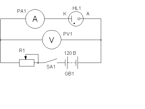 Рис. 1.1 Принципова електрична схема включення розрядної трубки при дослідженні газового розряду Якщо розрядну трубку з двома електродами, наповнену газом, ввімкнути в електричне коло з джерелом високої напруги GB1 і баластним резистором R1, який дає можливість регулювати струм у колі (рис. 1.1), то залежно від величини струму через газовий проміжок в ньому виникнуть різні види електричного розряду, які відрізняються фізичними процесами в об’ємі газу і на електродах, характером свічення і величиною спаду напруги Ua між електродами. На рис. 1.2 приведена типова залежність спаду напруги на газорозрядній лампі від величини струму, яка називається вольт-амперною характеристикою газового розряду. Ділянка 0а відповідає несамостійному темному розряду, а ділянка ab – самостійному темному розряду. Вертикальна ділянка cd, відповідає нормальному тліючому розряду. При подальшому збільшенню струму в трубці спостерігається аномальний тліючий розряд (ділянка de). При струмах від одиниць до сотень і тисяч ампер виникає дуговий розряд (ділянка fg). Ділянки bc і ef відповідають нестійким перехідним розрядам – від темного до тліючого і від аномального тліючого до дугового. Завдання до лабораторної роботи 1. Зібрати схему, зображену на рис. 1.1. 2. Дослідити ВАХ неонової лампи. 3. Побудувати ВАХ і визначити: а) потенціал U3 і струм запалювання розряду (І3=Іа); б) напругу горіння UГ та діапазон струмів тліючого розряду при цьому; в) вказати ділянки самостійного та несамостійного розрядів; г) для кожної ділянки ВАХ визначити величини диференціальних опорів: