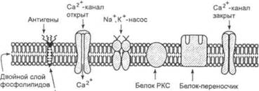 Рис.1. Схема строения клеточной мембраны Молекулы мембранных липидов имеют головку (участок, притягивающий воду и стремящийся взаимодействовать с ней, называемый гидрофильным) и хвост, который является гидрофобным (отталкивается от молекул воды, избегает их соседства). В результате такого различия свойств головки и хвоста липидных молекул последние при попадании на поверхность воды выстраиваются рядами: головка к головке, хвост к хвосту и образуют двойной слой, в котором гидрофильные головки обращены к воде, а гидрофобные хвосты - друг к другу. Хвосты находятся внутри этого двойного слоя. Наличие липидного слоя образует замкнутое пространство, изолирует цитоплазму от окружающей водной среды и создает препятствие для прохождения воды и растворимых в ней веществ через клеточную мембрану. Толщина такого липидного бислоя составляет около 5 нм. В состав мембран также входят белки. Их молекулы по объему и по массе в 40-50 раз больше, чем молекулы мембранных липидов. За счет белков толщина мембраны достигает 7 - 10 нм. Несмотря на то, что суммарные массы белков и липидов в большинстве мембран почти равны, количество молекул белков в мембране в десятки раз меньше, чем молекул липидов. Обычно белковые молекулы расположены разрозненно. Они как бы растворены в мембране, могут в ней смещаться и изменять свое положение. Это послужило поводом к тому, что строение мембраны назвали жидкостно-мозаичным. Молекулы липидов тоже могут смещаться вдоль мембраны и даже перепрыгивать из одного липидного слоя в другой. Следовательно, мембрана имеет признаки текучести и вместе с тем обладает свойством самосборки, может восстанавливаться после повреждений за счет свойства липидных молекул выстраиваться в двойной липидный слой. Белковые молекулы могут пронизывать всю мембрану так, что их концевые участки выступают за ее поперечные пределы. Такие белки называют трансмембранными или интегральными. Есть также белки, только частично погруженные в мембрану или располагающиеся на ее поверхности. Белки клеточных мембран выполняют многочисленные Функции. Для осуществления каждой функции геном клетки обеспечивает запуск синтеза специфического белка. Даже в относительно просто устроенной мембране эритроцита имеется около 100 разных белков. Среди важнейших функций мембранных белков отмечаются: 1) рецепторная - взаимодействие с сигнальными молекулами и передача сигнала в клетку; 2) транспортная - перенос веществ через мембраны и обеспечение обмена между цитозолем и окружающей средой. Существует несколько разновидностей белковых молекул (транслоказ), обеспечивающих трансмембранный транспорт. Среди них есть белки, формирующие каналы, которые пронизывают мембрану и через них идет диффузия определенных веществ между цитозолем и внеклеточным пространством. Такие каналы чаще всего ионоселективные, т.е. пропускают ионы только одного вещества. Есть также каналы, избирательность которых меньшая, например они пропускают ионы Na+ и К, К и С1~. Есть также белки-переносчики, которые обеспечивают транспорт вещества через мембрану за счет изменения своего положения в этой мембране; 3) адгезивная - белки совместно с углеводами участвуют в осуществлении адгезии (слипание, склеивание клеток при иммунных реакциях, объединение клеток в слои и ткани); 4) ферментативная - н