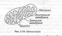 Міжмембранний ростір, чи перимітохондріальний простір, заповнений основною безструктурною речовиною, що містить глобулярні білки і деякі ферменти. Зовнішня мембрана гладенька, а внутрішня утворює численні гребнеподібні складки - кристи. Вони істотно збільшують її поверхню, забезпечуючи площу для розміщення мультиферментиних систем. Мембрани відокремлюють від цитоплазми внутрішній вміст мітохондрій - матрикс. У матриксі містяться рибосоми і мітохондріальна ДНК, що має кільцеву будову. Сучасні методи дозволили виявляти присутність особливих «елементарних часток» на внутрішній мітохондріальній мембрані (рис.1.20). Це ферменти АТФ - синтетази, що забезпечують сполучення фосфорилювання АДФ із реакціями в дихальному ланцюзі.
