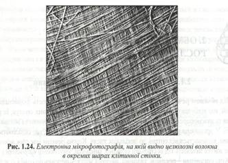 Мікрофібрили являють собою пучки довгих тонких молекул целюлози. До складу матрикса входять полісахариди і білки, багато з яких є ферментами, що каналізують синтез речовин, які входять до складу оболонки. Полісахариди матриксу представлені пектиновими сполуками і геміцелюлозами - змішаною групою полімерів занози, ксилоли й інших моносахаридів. Стінки сусідніх клітин з’єднує серединна пластинка, що складається з клейких желеподібних пектитів кальцію і магнію (рис. 1.23).