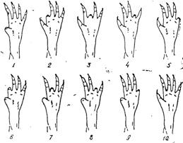 Рис. 2. Порядок ампутации пальцев у грызунов для целей мечения. Большие возможности изучения экологии млекопитающих открыл метод мечения и последующего выпуска животных для выявления их индивидуальных участков. Он получил широкое распространение при исследовании подвижности и контактов мелких млекопитающих и стал одним из способов абсолютного учета численности. Сущность метода заключается в следующем: на учетной площадке в шахматном порядке расставляются живоловки (величина площадки, интервал между ловушками, тип живоловки выбираются в соответствии с размерами и подвижностью исследуемых животных; применительно к мышевидным грызунам используются обычные мышеловки, а расстояние между рядами ловушек и лов ушкам и в ряду чаще всего составляет 10 м), Выловленных зверьков метят, например, путем отрезания пальцев (рис. 2), отмечают место поимки (№ ловушки) и выпускают. В следующий вылов отмечаются места поимки меченых и повторно выловленных зверьков, а отловленные немеченые зверьки метятся, выпускаются и т. д. После камеральной обработки материалов, полученных этим путем, становится возможным довольно точно выявить ядро оседло живущих на той или иной территории грызунов, а также отметить зверьков, забегающих со стороны или мигрирующих через учетную площадку. Однако часто возникает необходимость оценивать численность грызунов во время полевых наблюдений, и тогда возникает вопрос о времени, потребном для такого учета. По-видимому, учет можно было бы считать законченным, как только в ловушки перестанут попадаться немеченые зверьки (Н. И. Ларина, 1957), но при закладке учетных площадок среди обширных биотопов достичь такого положения нелегко. Теоретические расчеты (вычисление эмпирической формулы кривой развития процесса вылова) показывают, что продолжительность периода, требующегося для полного вылова обитателей площадки, зависит от уровня численности. В случае, когда на 100 ловушек ежедневно ловилось до 70 зверьков, учет должен завершиться на 15-е сутки. При ежедневном вылове (на такой же площади и при том же количестве ловушек) 20—30 зверьков, представляется возможным достичь их полного учета лишь через 40. суток. Однако практически (рис. 3) количество меченых зверьков в уловах быстро возрастает в первые дни учета, а затем, достигнув 60—70% от общего количества вылавливаемых зверьков, продолжает колебаться около этого уровня. Такое состояние, когда помечено не менее двух третей обитателей площадки, достигается уже к концу двухнедельного учета. По этим данным можно составить достаточно ясное представление об уровне численности грызунов в данной местности. Дальнейшие исследования должны решить вопрос о необходимой продолжительности учета при разной численности и подвижности грызунов. При работе в открытой местности, где норы грызунов хорошо заметны, применяется сплошная раскопка нор с выловом всех населяющих их зверьков. Так как раскопка нор и вылов зверьков по времени совпадают, удастся учитывать только действительных обитателей площадки. Эта методика широко применяется для учета обыкновенной полевки и других грызунов, имеющих неглубокие норы. Раскопке предшествует подсчет нор, отверстия тщательно затыкаются жгутами травы. При раскопке регистрируют количество раскопанных нор, входных отверстии, видовую принадлежност