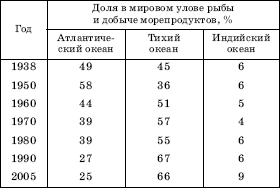 Рис. 1. Динамика мирового рыболовства, добычи морепродуктов XX в. Развитие мирового рыболовства на протяжении XX в. не было равномерным. Рисунок 1 показывает, что довоенный уровень рыболовства был восстановлен уже к 1950 г., а затем в течение 20 лет наблюдался очень быстрый его подъем: в 1950–1970 гг. уловы возросли в 3,3 раза при среднегодовом приросте в 2,4 млн т. Неудивительно, что в литературе этот период иногда называют «золотым веком» рыболовства. Объяснить такой подъем можно несколькими причинами – и модернизацией траулерного флота, и переходом от прибрежного рыболовства к дальнему экспедиционному лову, и тем, что за годы Второй мировой войны биоресурсы океанов – особенно Атлантического – успели естественным путем восстановиться. Однако уже в 1970-х гг. результаты перелова рыбы привели к резкому сокращению темпов развития отрасли, которые затем с большим трудом удалось восстановить, но, можно сказать, с потерей качества. Под словом «качество» следует прежде всего понимать изменения в составе мирового улова, в котором на рыбу приходится около 85 %, на беспозвоночных – 10 %, а на млекопитающих и прочих водных животных и водные растения – остальные 5 %. В период «золотого века» основной улов рыбы обеспечивали 10 наиболее ценных ее семейств – сельдевые, тресковые, ставридовые, скумбриевые, анчоусовые и др. Но в результате значительного перелова и исчерпания именно наиболее ценных биоресурсов их доля в общем улове сильно сократилась, а преобладать в нем стали менее ценные по пищевым качествам виды рыбы (мойва, минтай, макрель, хек). Можно добавить, что соотношение между морским и пресноводным рыболовством также несколько изменилось: доля последнего увеличилась (до 15 % в середине 1990-х гг.). Таблица 1. РАСПРЕДЕЛЕНИЕ МИРОВОГО УЛОВА РЫБЫ И ДОБЫЧИ МОРЕПРОДУКТОВ ПО ОКЕАНАМ
