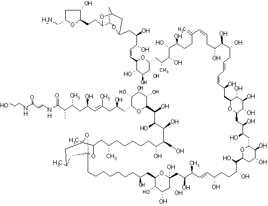 мякі корали Palythoa toxica Встановлення будови і стереохімії палітоксину, завершене в 1981р. об’єднаними групами Й.Хірата і Й.Кіші, виявилось визначною подією в біоорганічній хімії. Молекула палітоксину являє собою унікальну структуру, довгий ланцюг якої побудований з ди-, три- і тетрагідрокситетрагідропіранових і фуранових циклів, сполучених насиченими і ненасиченими зв’язками поліолів, на його N-кінці знаходиться первинна аміногрупа, а С-кінець ацильованим залишком -аміноакриламінопропанолу. Палітоксин володіє потужною дією: при внутрівенному введенні мишам його LD50 становить 0,15 мкг/кг, при внутрічеревному -0,4мкг/кг, а для мавп він ще токсичніший- LD50 0,078 мкг/кг. Летальний кінець наступає через 5-30хв. в результаті звуження судин, аритмії, коронарних спазм і зупинки дихання. Цікаво, що в сублетальних дозах палітоксин проявляє високу протипухлинну активність. Механізм дії палітоксину не повністю зрозумілий, проте відомо, що він аналогічно уабаіну, але значно сильніше, зв’язується з Na+, K+ - АТФазами чутливих клітин(нервової тканини, серця, еритроцитів) і утворює в місцях зв’язування пори в цитоплазматичних мембранах, в результаті чого клітини втрачають іони K+ і Са2+ і гинуть.