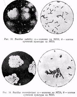 Лучший способ рассмотрения спор и определения их расположения в клетке – микроскопирование живых клеток с фазово-контрастным устройством. В почвах наиболее часто встречаются следующие виды рода Bacillus. Вас. subtilis – колонии сухие, бесцветные или серовато-белые, мелкоморщинистые или образующие бархатистый налет, расплывающиеся по поверхности агара и тогда имеющие по краям складки; край более или менее волнистый; плотно прилегают к агаровой среде. Палочки короткие и тонкие 3–5×0,6 мкм; нередко соединены в длинные нити. Споры овальные 0,9×0,6 мкм, расположены без строгой локализации – эксцентрально или ближе к центру, но не строго центрально. Вас. mesentericus – колонии обычно плотно прилегают к агаровой среде, иногда срастаются со средой, тонкие, морщинистые, серовато-белые, кремовые или желто-бурые. Имеет много разновидностей. Из них часто встречается Вас. mesentericus ruber, колонии которого окрашены в розоватый цвет, и Вас. mesentericus niger, у которого колонии черного цвета. Палочки тонкие, длинные и короткие 3–10×0,5–0,6 мкм, одиночные или соединены в длинные нити. Споры овальные и продолговатые 0,9×0,5 мкм, могут располагаться в любой части клеток. При формировании спор клетки не раздуваются. Вас. cereus – колонии плоские, относительно диффузные с ровной мелкобугристой (мучнистой, крупитчатой) поверхностью, слегка вогнутые, матовые, с волнистыми краями. Клетки толстые, 1,0–1,5 мкм в поперечнике и длиной 3–5 мкм, иногда более длинные; одиночные и соединенные в цепочки и нити. Споры овальные, 1,2–1,5×0,9 мкм, расположены эксцентрально. Плазма клеток зернистая или вакуолизированная. Нас simplex – колонии напоминают Вас. cereus. Отличаются образованием зеленовато-желтого пигмента, выделяющегося в среду. Клетки мелкие 2–5×0,6 мкм, чаще всего одиночные, цепочки не образуют. Споры овальные 0,9×0,6 мкм, расположены эксцентрально. Вас. cereus var. mycoides – колонии плоские, ризоидные или мицелиевидные, стелющиеся по поверхности агара. Клетки 5–10×0,8–1,2 мкм, иногда длиннее; одиночные или соединены в длинные цепочки-нити; плазма клеток вакуолизирована. Споры продолговатые, овальные 1,0–1,5×0,8–1,0 мкм, расположены эксцентрально.