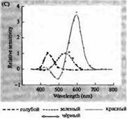 Рис. 3. Спектры чувствительности фоторецепторов человека и различных зрительных пигментов. (А) Кривые спектров чувствительности трех цветовых зрительных пигментов, показывающие пики поглощения на длинах волн, соответствующих голубому, зеленому и красному. (В) Спектры чувствительности колбочек к голубому, зеленому и красному цветам, и палочек (показано черным) у макак. Ответы регистрировались при помощи всасывающих электродов, усреднялись и нормализовывались. Кривые спектра палочки были получены при исследовании зрительных пигментов на людях. (С) Сравнение спектров колбочек обезьян и человека при помощи теста чувствительности к цвету. Непрерывная кривая показывает эксперимент по определению чувствительности к цвету у человека, при предъявлении ему света разной длины волны. Пунктиром показаны результаты, предсказанные на основе регистрации токов в отдельных колбочках, после коррекции поглощения света в хрусталике и пигментами на пути к наружному сегменту. Совпадение между результатами обоих опытов удивительно высокое. Если мы проецируем на белый экран два пучка света различных цветов одновременно... мы видим только один цвет, более или менее отличный от обоих этих цветов. Мы сможем лучше понять выдающийся факт того, что мы способны воспринимать все оттенки в составе внешнего света путем смеси трех основных цветов, если мы сравним глаз сухом... В случае звука... мы слышим более длинные волны как низкие тона, а короткие волны - как высокие и пронзительные, кроме этого ухо способно улавливать одновременно много звуковых волн, т.е. много нот. Однако они β данном случае не сливаются в один сложный аккорд, подобно тому, как различные цвета... сливаются в один сложный цвет. Глаз не может показать разницу, если мы заменяем оранжевый цвет на красный или желтый; но если мы слышим ноты до и ми, звучащие одновременно, нам подобное звучание не кажется нотой ре. Если бы ухо воспринимало музыкальные тона подобно тому, как глаз воспринимает цвета, каждый аккорд мог бы быть представлен комбинацией трех постоянных нот, одной очень низкой, одной очень высокой и одной промежуточной, вызывая все возможные музыкальные эффекты только путем изменений относительной громкости этих трех нот... Однако мы способны видеть плавный переход цветов одного в другой через бесконечное множество оттенков и градаций... То, каким образом мы воспринимаем каждый из цветов... зависит е основном от строения нашей нервной системы. Надо признаться, в настоящее время ни у человека, ни у четвероногих не описана анатомическая база для подтверждения теории восприятия цвета. Эти точные и дальновидные предсказания были подтверждены серией различных наблюдений. При помощи спектрофотометрии Вальд, Браук, МакНикол и Дартнэл с коллегами показали наличие в сетчатке человека трех типов колбочек с различными пигментами. Также Бейлор с коллегами сумели отвести токи от колбочек обезьян и человека. Было обнаружено, что три популяции колбочек имеют различные, но перекрывающиеся диапазоны чувствительности к голубой, зеленой и красной части спектра. Оптимальные длины волн для возбуждения электрических сигналов в точности совпали с пиками поглощения света зрительными пигментами, установленными при помощи спектрофотометрии и при психофизических экспериментах по измерению чувс