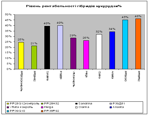 З точки зору ефективності виробництва найефективнішим виявився гібрид PR38R92. При його дослідженні отримали найбільші показники ефективності : 1. рентабельність виробництва 46%, 2. прибуток на 1 ц. насіння (при ціні реалізації 60 грн. за 1 ц.) – 18,94 грн. 3. прибуток на 1 га. посіву (при ціні реалізації 60 грн. за 1 ц.) – 1744,5 грн. Всього даний гібрид приніс 174,4 тис. грн. чистого прибутку на 100 га посіву. Отже можна зробити висновок, що найбільш ефективним при сталих витратах на 1 га посіву виявився гібрид PR38R92, переважно за рахунок урожайності. Для кращого порівняння ефективності вирощування гібридів кукурудзи зобразимо графічно рівні рентабельності кожного гібриду.