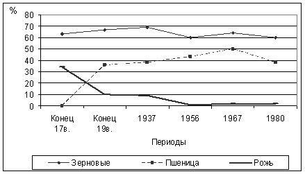 Рисунок 1 – Динамика посевов зерновых культур на территории Курганской области, % к обрабатываемой пашне В первую четверть XIX в. яровые хлеба вытесняют озимые. Однако, чтобы выжить в голодные годы, земледелец резко менял соотношение культур на своих пашнях, высевая озимую рожь. Так, посевы озимой ржи в 1913 г. составили 65 тыс. га, в 1940 г. – 191,4 (19,1 %) при средней урожайности 9,8 ц/га, в 1960 г. было засеяно 149 тыс. га (12,8 ц/га). Площади посева озимой пшеницы в Зауралье незначительные и резко колеблются по годам. Но интерес к этой культуре не снижается. С 1938 г. озимую пшеницу стали изучать на сортоучастках. Только за восемь лет (1949-1956 гг.) было испытано 55 сортов. Лучшим из них признан сорт Ульяновка, который был районирован, но в производстве практически не возделывался. Вследствие частой зимней гибели посевов в 1957 г. озимую пшеницу сняли с производства. Селекционерами нашей страны созданы замечательные зимостойкие и урожайные сорта озимой пшеницы – Мироновская 808, Альбидум 114, Безостая 1, Комсомольская 56 и др. Появились сорта сибирских селекционеров – Сибирская нива, Омская 3, Северная заря, Курганская озимая и др. В последнее время научный и практический интерес стала представлять новая для наших мест культура – тритикале. Путем гибридизации в сложную наследственную основу пшеницы добавился геном озимой ржи, при этом ядерная наследственность приобрела качественно новую структуру и свойства. Особого внимания заслуживают 42-хромосомные трехвидовые тритикале (амфидиплоиды), созданные впервые в мире А.Ф. Шулындиным путем скрещивания озимой ржи, озимой твердой и мягкой пшеницы. Благодаря сочетанию таких важных признаков, как многоколосковость ржи и многоцветковость пшеницы, трехвидовые тритикале обладают более высокими потенциальными возможностями в повышении продуктивности и зимостойкости, чем озимая пшеница. Озимая пшеница и тритикале являются источником получения зерна с высоким содержанием белка и клейковины. Так, по данным Ялуторовского ГСУ (1987-1988 гг.), содержание белка в зерне озимой пшеницы сорта Альбидум 114 составляло 17 %, Омской озимой – 15,9, тритикале АД 3/5 – 17,2. клейковины соответственно 31,5 и 35 %. Содержание белка в зерне озимой ржи Чулпан 10-12 %. Озимое тритикале – культура больших возможностей. Белок у тритикале лучше пшеничного сбалансирован по незаменимым аминокислотам. Зерно и отруби – ценный источник комбикормов для всех животных. Как зерновая культура используется для выпечки хлебобулочных изделий, как кормовая – имеет универсальное применение [1]. 2. Народно-хозяйственное значение озимой ржи Озимая рожь – важная зерновая продовольственная и кормовая культура, особенно в районах с ограниченным возделыванием озимой пшеницы. В зерне ржи в зависимости от условий выращивания и сорта содержится 9-17 % белка, 52-63 % крахмала и 1,6-1,9 % жира. Ржаной хлеб (обдирный, орловский, рижский, бородинский и другие сорта) – ценный пищевой продукт, отличается высокой калорийностью и имеет специфический вкус и аромат. Он содержит полноценные белки и витамины A1, B1, В2, Е, РР и другие, необходимые человеку. По переваримости и усвояемости ржаной хлеб уступает пшеничному, однако превосходит его по биологической ценности белка, содержит примерно в 1,5 раза больше лизина и несколько больше треонина и тирозина. Зерно ржи используют в спиртовой и крахмалопаточ